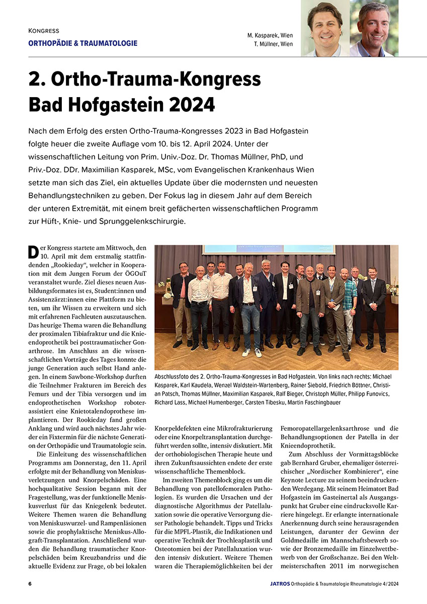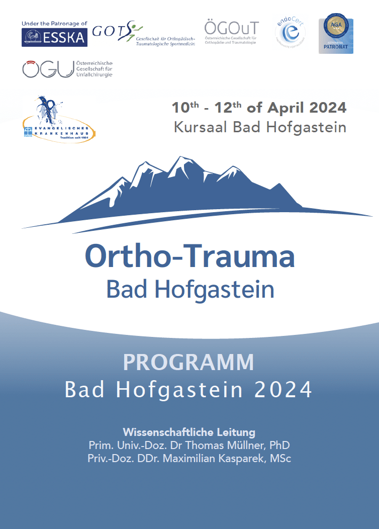 Nach dem Erfolg des ersten Ortho-Trauma Kongresses 2023 in Bad Hofgastein folgte heuer die zweite Auflage vom 10. bis 12. April 2024. Unter der wissenschaftlichen Leitung von Prim. Univ.-Doz. Dr. Thomas Müllner, PhD und Priv.-Doz. DDr. Maximilian Kasparek, MSc vom Evangelischen Krankenhaus Wien setzte man sich das Ziel, ein aktuelles und interessantes Update über die modernsten und neuesten Behandlungstechniken zu geben. Der Fokus lag in diesem Jahr im Bereich der unteren Extremität, mit einem breit gefächerten wissenschaftlichen Programm zur Hüft‑, Knie- und Sprunggelenkschirurgie.